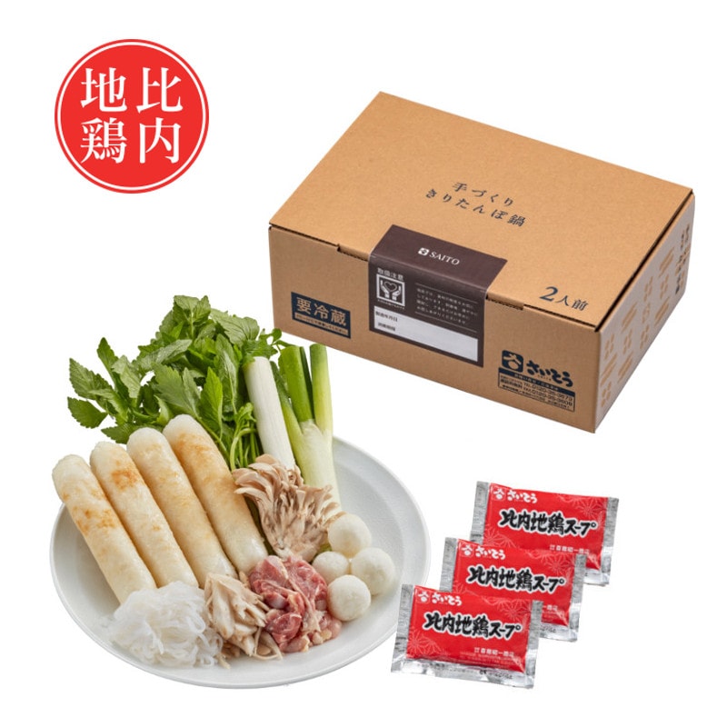 手づくりきりたんぽ4本、だまこ餅4個、比内地鶏肉120g、比内地鶏スープ50g×3袋、せり60g、ねぎ80g、舞茸50g、糸こんにゃく100g、笹がきごぼう40g
