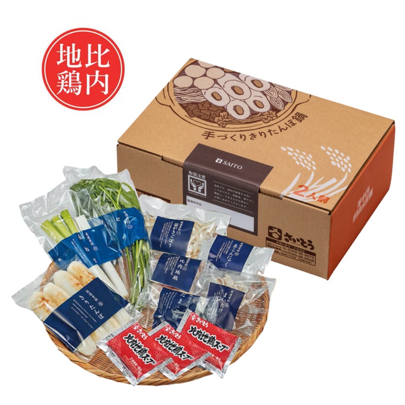 手づくりきりたんぽ4本、だまこ餅4個、比内地鶏肉180g、比内地鶏スープ50g×3袋、せり100g、ねぎ100g、舞茸50g、糸こんにゃく100g、笹がきごぼう40g